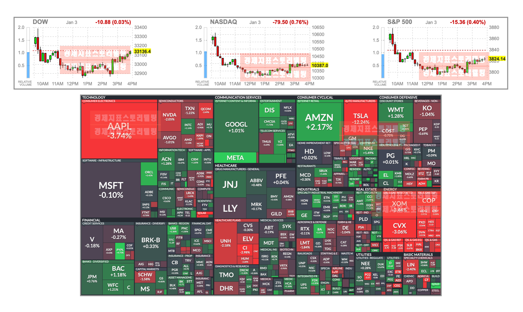 2023년 1월3일(화)에 미국 뉴욕 증시의 2023년 첫 거래일이 진행됐고 다우존스는 -0.03%, 나스닥은 -0.76%, S&P 500은 -0.40%로 장을 마감했습니다. 비록 2023년 첫 거래일은 하락으로 미증시가 마감했지만 위 하단 자료인 S&P 500 지수의 시장지도를 보면 박스 크기가 큰 시가총액 상위 종목인 애플, 테슬라, 원유 부문, 헬쓰케어는 하락을 의미하는 적색을 나타내고 있지만 이를 제외한 시장 전반은 상승을 의미하는 녹색으로 발광하며 1월3일에 미증시의 실제 장의 모습은 하락이 아닌 상승 종목이 더 많은 상승장이 진행됐다는 것을 파악할 수 있습니다. 다시 말해, 나스닥에 포함된 일부 시가총액 상위 빅테크 종목의 하락세를 제외할 경우 2023년 미증시의 첫 거래일은 상승했다는 것을 파악할 수 있습니다.