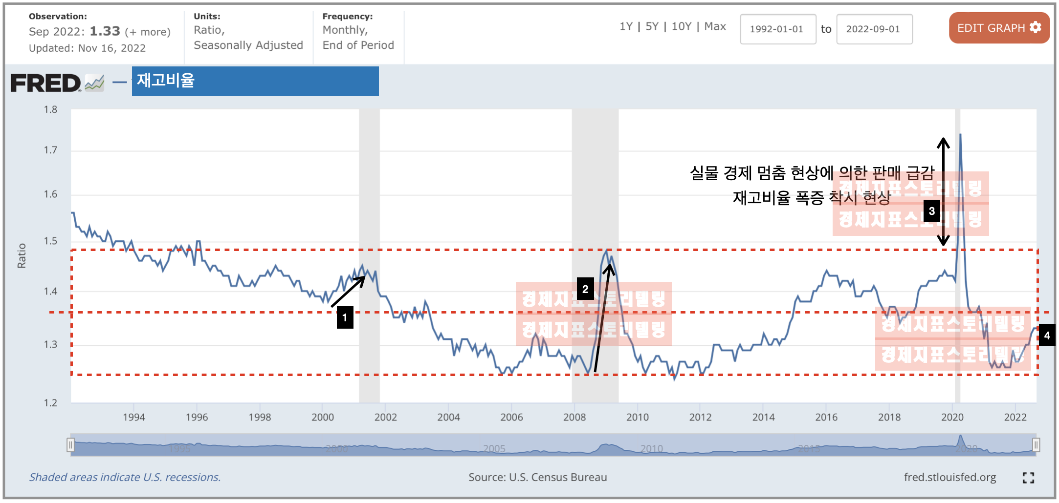 위 자료 우측에 3번으로 표기한 2020년 초기에도 코로나19 감염 확산으로 미국 경제가 멈춰서게 되자 미국의 재고비율이 급증하며 붉은 박스 상단 위로 솟구치며 미국 경제가 호순환될 수 없기에 미국 기업들이나 주식시장이 악영향을 미치게 됨을 설명해주었습니다.