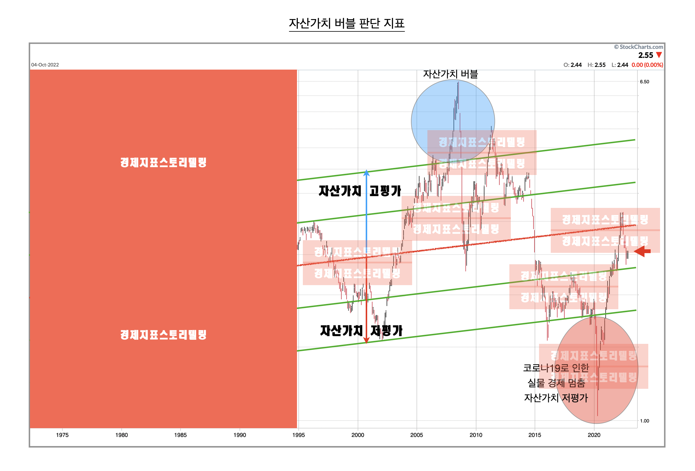 위 자료는 경제지표스토맅레링에서 설정하여 수 년간의 검증을 마친 자산가치 버블 판단 지표입니다. 위 자료 중앙에 붉은 선과 파란 선으로 자산가치가 고평가인지 저평가인지를 가늠할 수 있는 기준선이 기입되어있습니다.