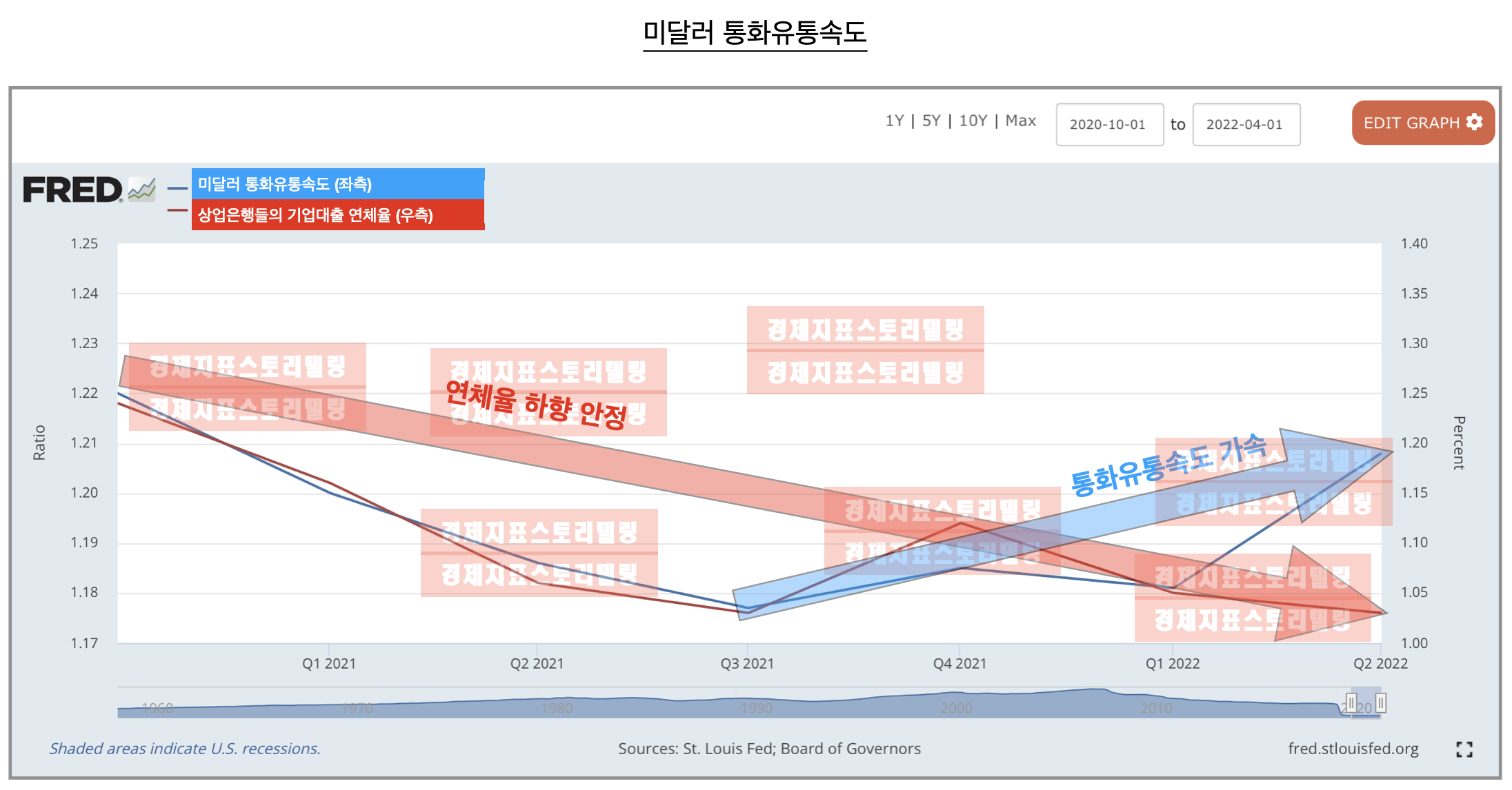 위 자료 우측에 파란 화살표로 표기한 부분을 보면 미달러 통화유통속도는 2021년 3분기부터 가속세로 전환되었고 이에 따라 미국 상업은행들의 연체율은 더욱 하향 안정화되었습니다. 쉽게 말해 2021년 3분기부터 미국 경제는 추가적인 유동성 공급이 없더라도 또는 기준금리 인상을 통해 시장의 미달러 유동성을 흡수하더라도 실물 경제 스스로 자생할 수 있는 조건이 갖춰졌기에 현재의 미달러 초 강세 조건에도 불구하고 미국 상업은행 연체율이 하향 안정화되고 있습니다.