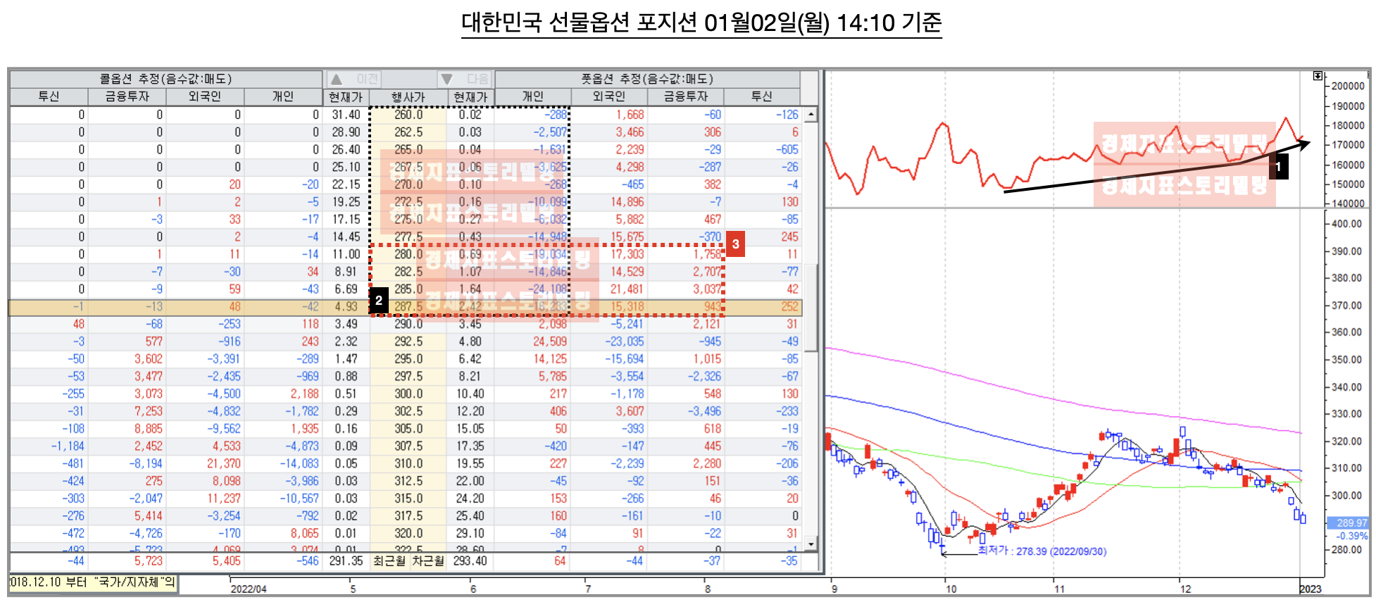 위 자료는 1월2일(월) 14시10분 기준으로 대한민국의 선물옵션시장의 포지션을 분석한 것입니다. 위 자료에 2번으로 표기한 검정 실선 박스를 보면 외국인이 늘 즐겨 사냥하는 개인의 파란 숫자가 풋옵션에 290 미만 구간에 들어섰고 외국인은 290 미만 구간으로 지수가 하락할 것에 베팅하고 있습니다. 즉 외국인은 지수가 하락할 경우에 개인의 파란 숫자 포지션도 사냥하고 자신의 풋옵션 매수포지션에서도 수익이 발생하니 오늘 국내 기관이 주도하는 시장의 하락세를 즐겁게 관망한 것이죠.