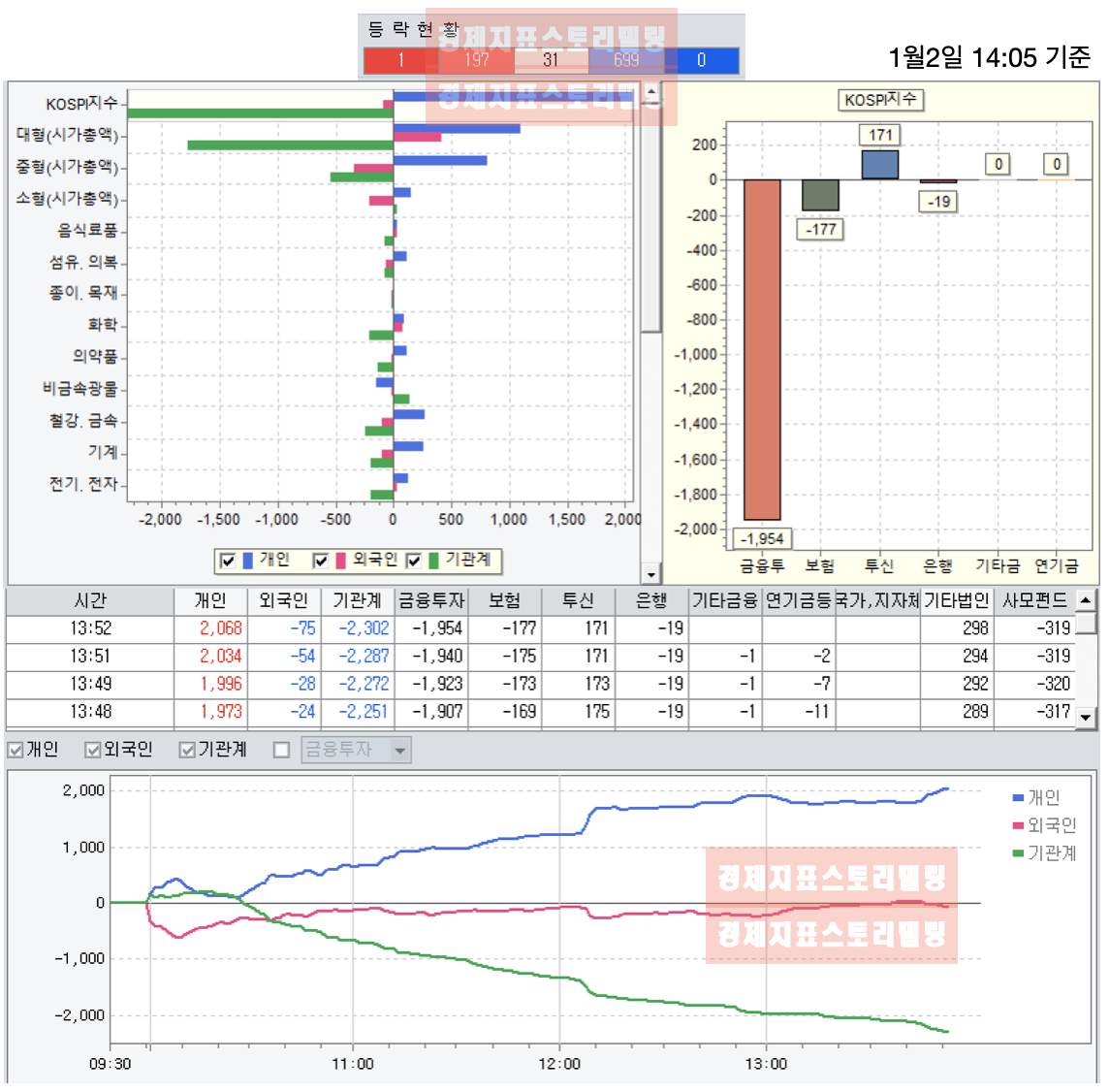 위 자료는 1월2일(월) 14시05분 기준으로 코스피 시장의 외국인, 기관, 개인의 수급을 조회한 것입니다. 국내 기관은 장 시작 이후 줄곧 대형주 매도세를 강화하며 코스피의 하락세 강화를 유도했고 이에 개인이 대형주 매수세로 맞서며 지수의 하락 폭을 감소시켰고 외국인은 관망세를 나타냈습니다.