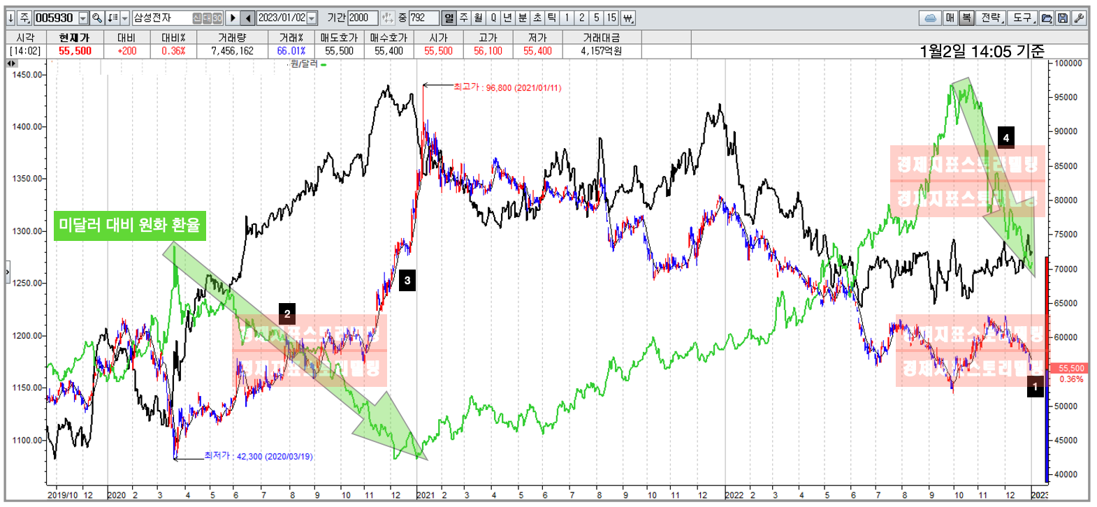 그런데 위 자료의 좌측에 2번으로 표기한 부분을 보면 녹색 화살표로 표기한 미달러 대비 원화 환율이 하락하며 원화 가치가 강세를 나타내던 기간에 3번으로 표기한 삼성전자의 주식가격이 상승 추세를 나타냈음을 확인할 수 있습니다.
