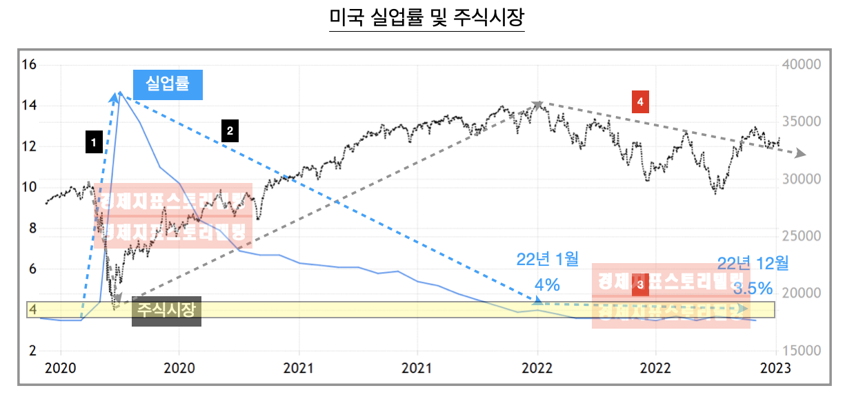 3번으로 표기한 기간을 보면 2022년 1월을 제외하고 미국 실업률은 미국 건국이래 몇 번 발생한 적 없는 3% 수준의 실업률 실적을 나타내며 경제 개선세가 지속되고 있음을 나타냈는데 이럴 경우 앞서 살펴본 바와 같이 실업률이 하락하는 호시절에 주식시장은 상승해야 합니다. 그런데 4번으로 표기한 기간을 보면 2022년 1월부터 미국뉴욕증시는 하락세를 나타냈고 9월 말부터 상승세가 진행되며 2022년 1월부터 형성된 하락추세를 2022년 말에 벗어났습니다.